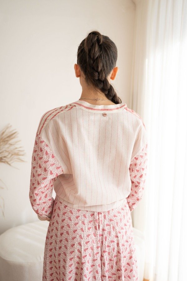 Esta camisola está realizada con la técnica de Upcycling, utilizando retazos excedentes de otras prendas.