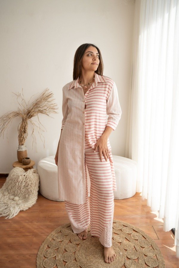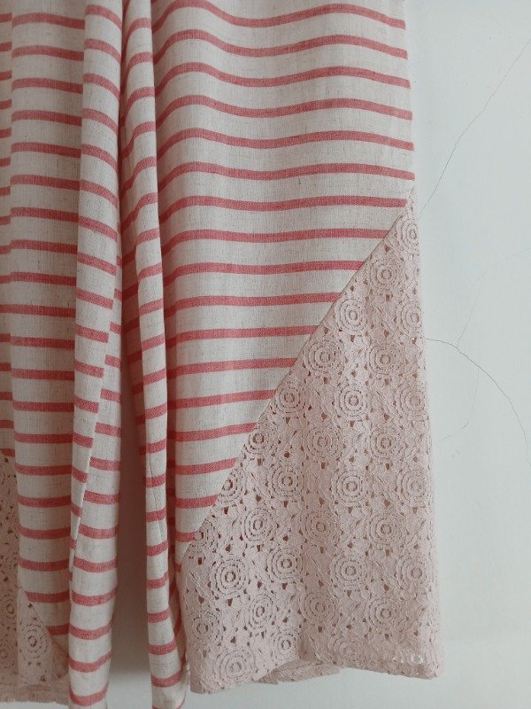 Pantalón de corte Wide leg confeccionado en lino dealgodón. La cinturilla se ubica en la cintura. Posee un cierre invisible trasero y un recorte de encaje a la altura de los tobillos.