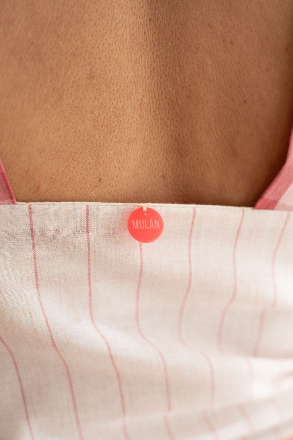 Este Vestido es ideal para el verano por su frescura y comodidad. Posee cuello solapa y breteles en la espalda, lo cual lo hace muy original. Tiene pinzas delantera y de busto. El corte es a la cintura y el largo es midi. Con cartera central abotonada. Está confeccionado en lino de algodón.