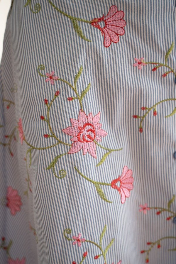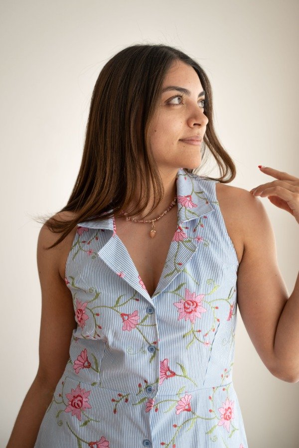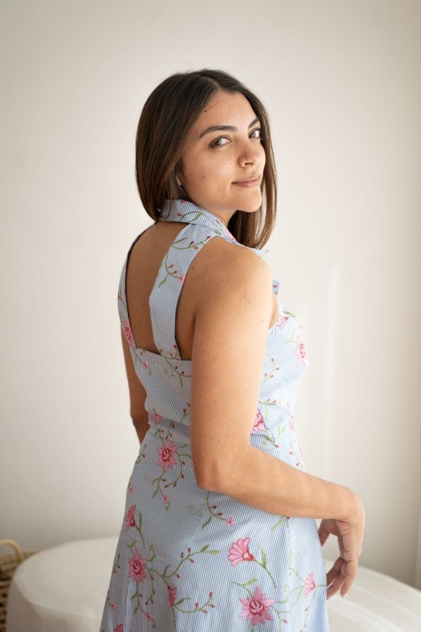 Este Vestido es ideal para el verano por su frescura y comodidad. Posee cuello solapa y breteles en la espalda, lo cual lo hace muy original. Tiene pinzas delantera y de busto. El corte es a la cintura y el largo es midi. Con cartera central abotonada. Está confeccionado en poplín de algodón bordado.
